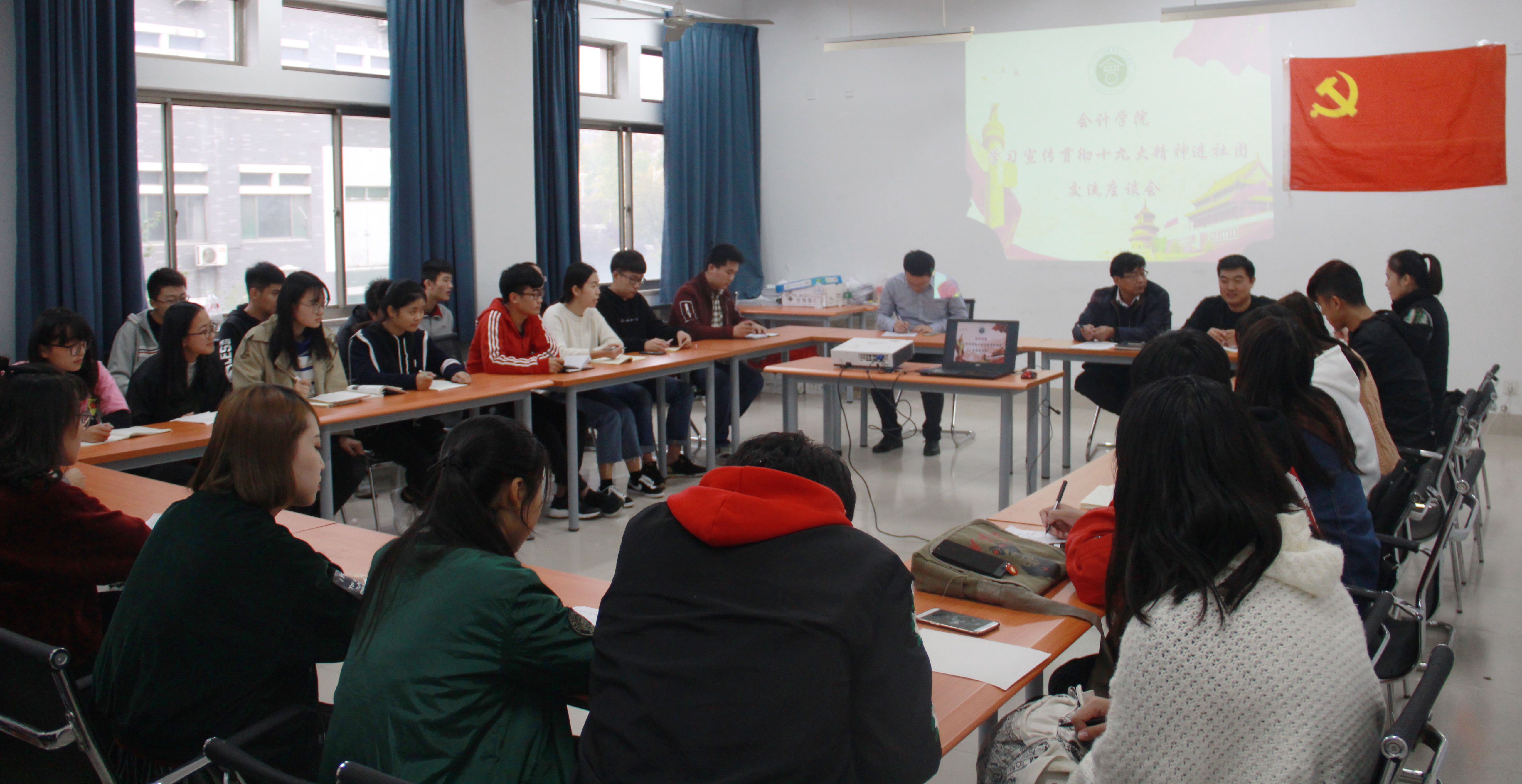 为认真学习宣传贯彻党的十九大精神,10月31日下午,会计学院于文外楼305会议室召开学习宣传贯彻党的十九大精神进社团交流座谈会,会计学院党总支副书记石瑞宝、团总支老师任正实、学生会主席团、全体社团负责人及部分社团会员代表参加座谈会。张月阳老师主持座谈会。