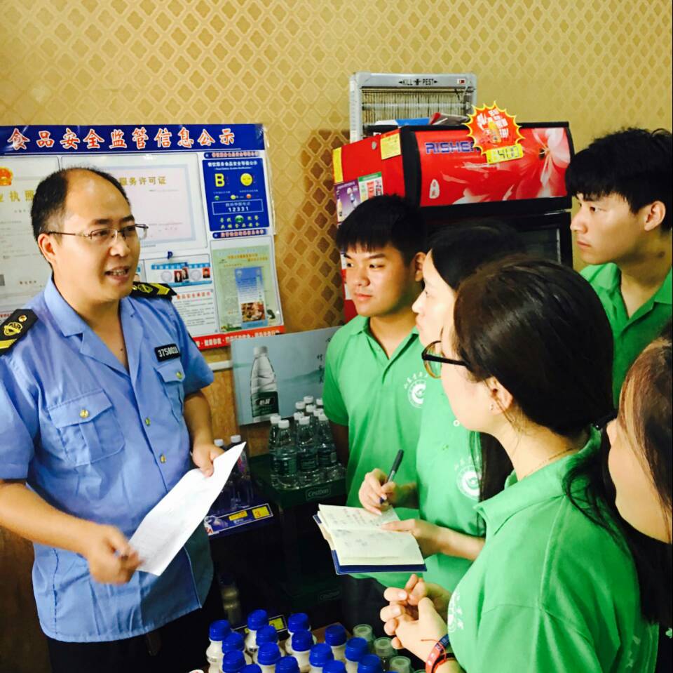 在协助执法过程中,队员们跟随食品安全稽查大队走访商业街,运用学到的检测知识参与一线食品安全检查工作,跟随药监局相关领导到水润坊水厂和兰陵酒业等现代化食品企业,了解“食品可追溯”系统的建立与实施过程,并将突击检查中不合格的商户在兰陵食品药品监管局微信平台集中公示。