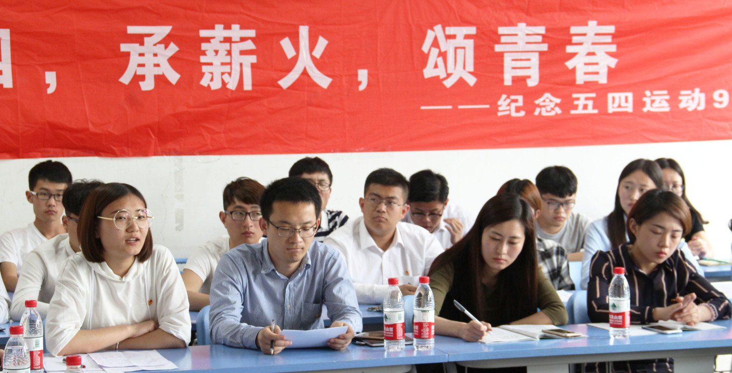 活动中,从观看“五四”运动专题视频,到观看“校园采访——山青学子眼中的五四运动”视频,再到聆听诗朗诵《聆听青年》,这些独具“青年”“政治”特色,贴近学生实际的主题团日活动内容,深深激发了广大团员青年勇于担当、勇于奉献、努力实现人生理想的热情和期盼。伴随着同学们关于“对五四运动的看法”“五四运动对当代大学生的现实意义”等话题的分享,团员青年积极与校领导刘涛等受邀嘉宾进行对话交流,现场氛围活跃融洽。几位同学从不同角度畅谈了关于五四运动、五四精神、五四青年节的感想和体会。刘涛认真聆听同学们的发言,不时低头记录,并指出“山青学子应该更加自觉地传承和弘扬好五四精神,将五四精神融入到山青精神中来,敢于担当,勇于奉献,为学校本科迎评创建工作贡献自己的一份力量。”其他受邀嘉宾也积极参与到分享与讨论之中,蒋涛涛号召广大青年学子要有家国精神,有理想情怀,把青春梦融入中国梦。许维祥指出,传承五四精神首先要了解五四运动的背景,认清五四运动的内核,同学们要学会正确分析历史,分析国家事件。张振国提到,历史不是用来记忆的,而是用来反思的。青年群体应该有梦想、有信仰,并积极落实到行动上。