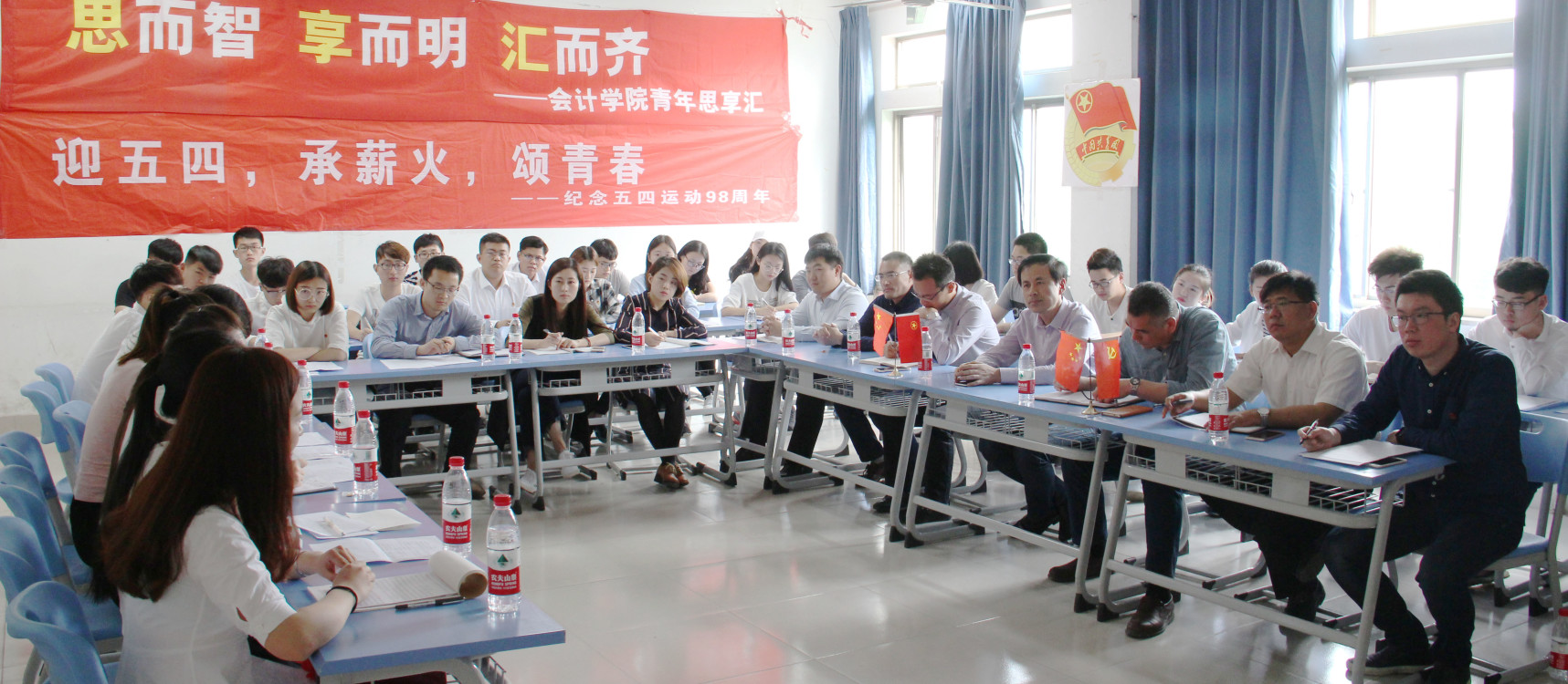 5月4日下午,文外楼316教室中,鲜艳的团旗、闪亮的团徽、醒目的五四宣传标语,烘托出了朝气蓬勃、青春活力的节日气氛。在五四青年节这个属于青春的节日,校领导刘涛来到会计学院“青年思享汇”活动现场,深入广大团员青年之中,畅谈五四精神,分享人生感悟,共话青春成长。校团委副书记蒋涛涛、省青少年研究所副教授张振国受邀出席,会计学院院长许维祥、党总支副书记石瑞宝、团总支学工办老师和团员青年代表参加了此次活动。