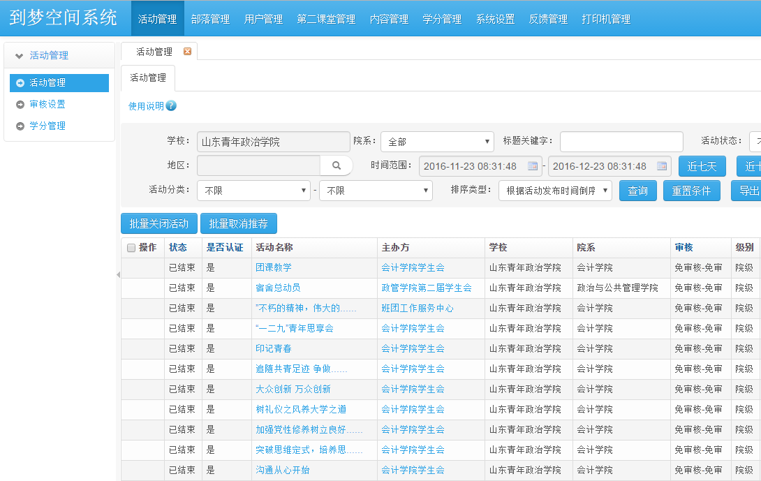 会计学院自9月底开始试行“第二课堂成绩单”,“第二课堂”活动全部通过“到梦空间”APP创建和发起,学生可随时登录APP浏览并报名参加自身感兴趣的活动,活动结束后自动生成参与记录,最终生成整个大学期间的“第二课堂成绩单”,作为学生综合素质培养的重要依据。目前,我院的所有活动均通过“到梦空间”组织开展,期间相关老师及学生干部外出学习了其他高校的成熟经验与做法。
