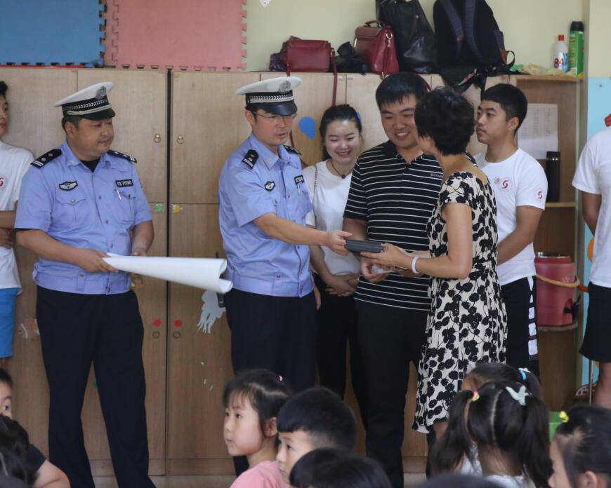 会计学院青年马克思--文明行为养成暑期社会实践团队指导教师任正实与李沧区交警大队工作人员以及天才宝贝幼儿园园长做了充分的沟通交流,详细了解了对孩子进行安全教育的工作重点和孩子成长中多发的安全问题、隐患以及应对措施。为了更好地开展对于孩子们的安全教育工作,交警大队宣传科还赠送李沧区天才宝贝幼儿园安全教育相关光盘手册。