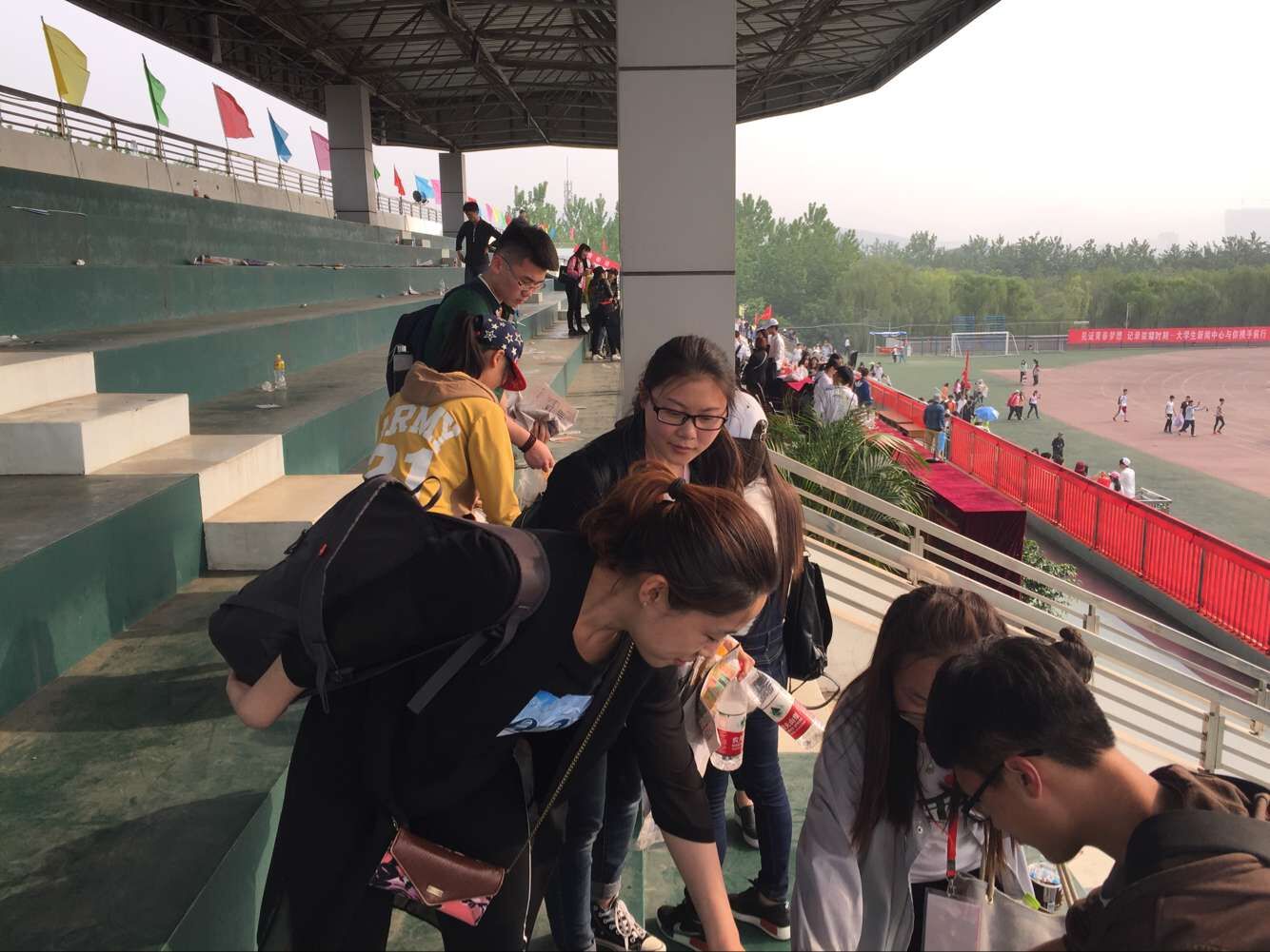 4月23日,我校田径运动会的第一天,有众多比赛项目决出名次,教师组、学生组的比赛都非常激烈,一个一个破纪录的消息被广播出来,竞技体育的魅力也感染着看台的观众们。由于运动员在看台休息补充水分,观众们为运动员加油助威喝水保护嗓子,看台上有很多喝空的矿泉水瓶,在一天比赛结束观众离场后,有一些空水瓶就被遗忘在了看台上,同样没有带走的是观众们垫着坐在屁股下面的各种杂志、报纸。为了保持观众席的环境,为比赛日第二天的观众提供整洁舒适的观赛感受,我院在督促学生随手带走垃圾,保持会计学院观众区干净的情况下,组织学生党员对看台其他区域进行打扫,充分发挥党员的服务精神和模范带头作用,并以此号召大家养成随手带走垃圾的习惯,保持看台卫生。