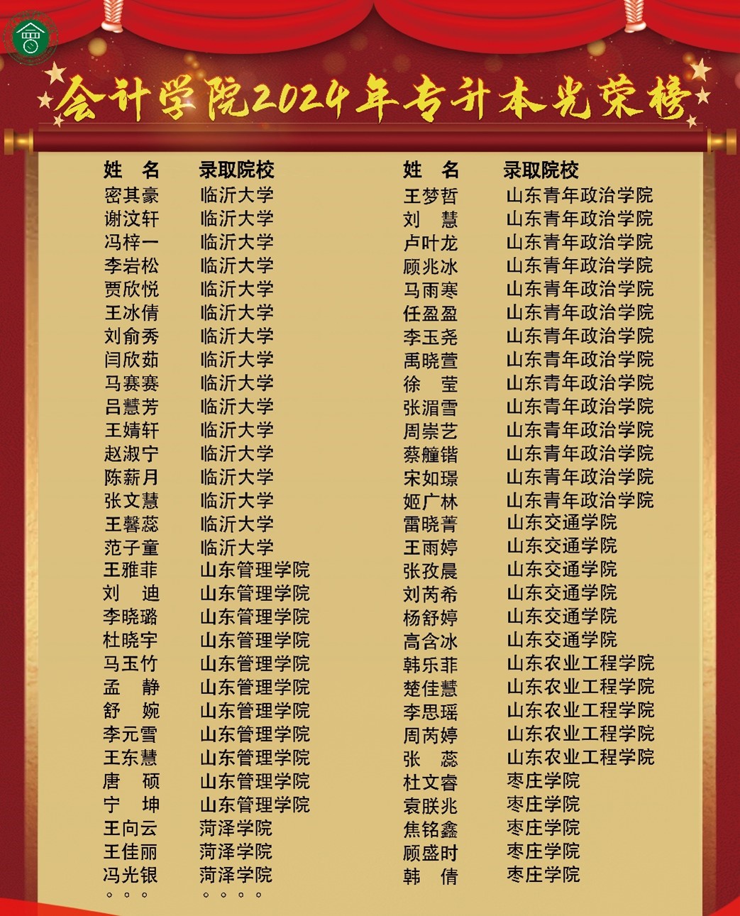 近日,山东省2024年普通专升本录取工作已结束,会计学院专升本考试喜获佳绩,有209名学子分别被临沂大学、山东交通学院等本科院校录取,录取率达77.4%,报录比达95%。