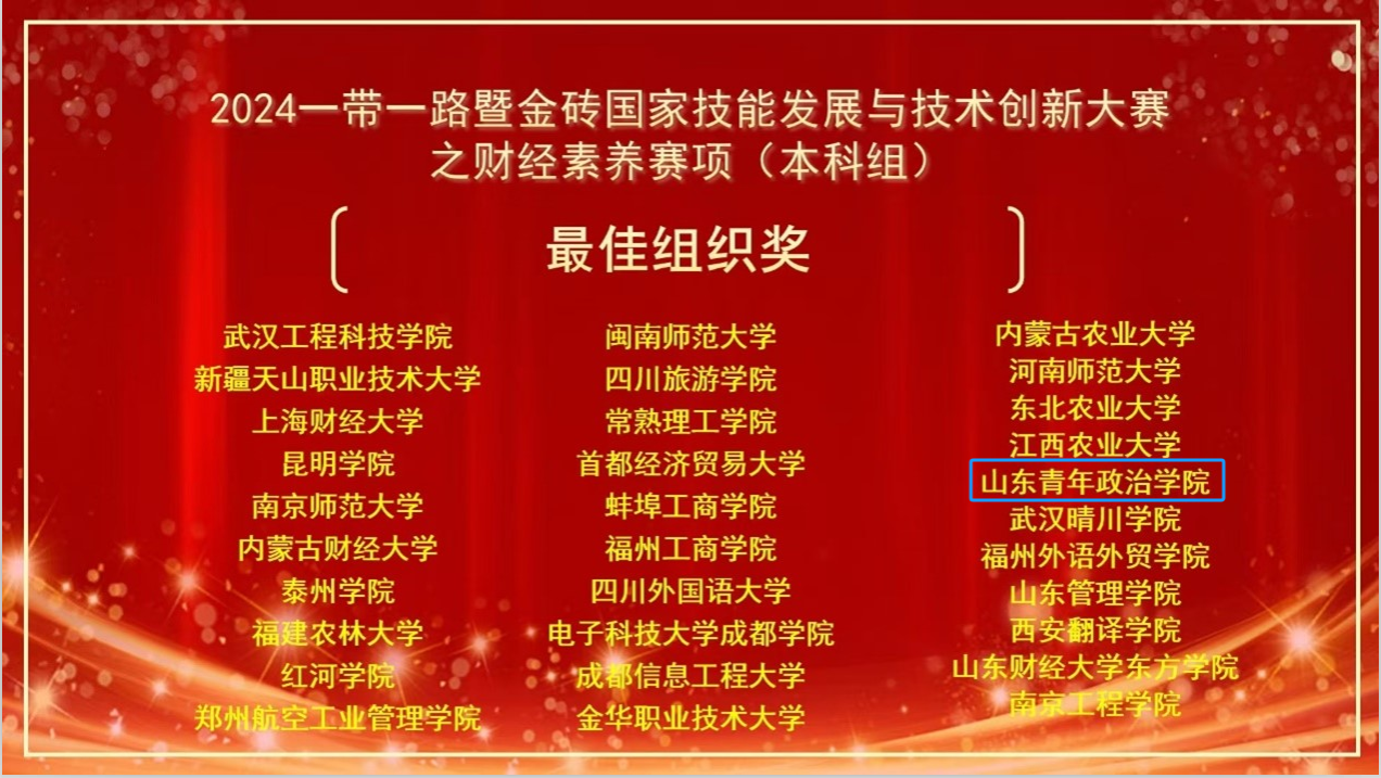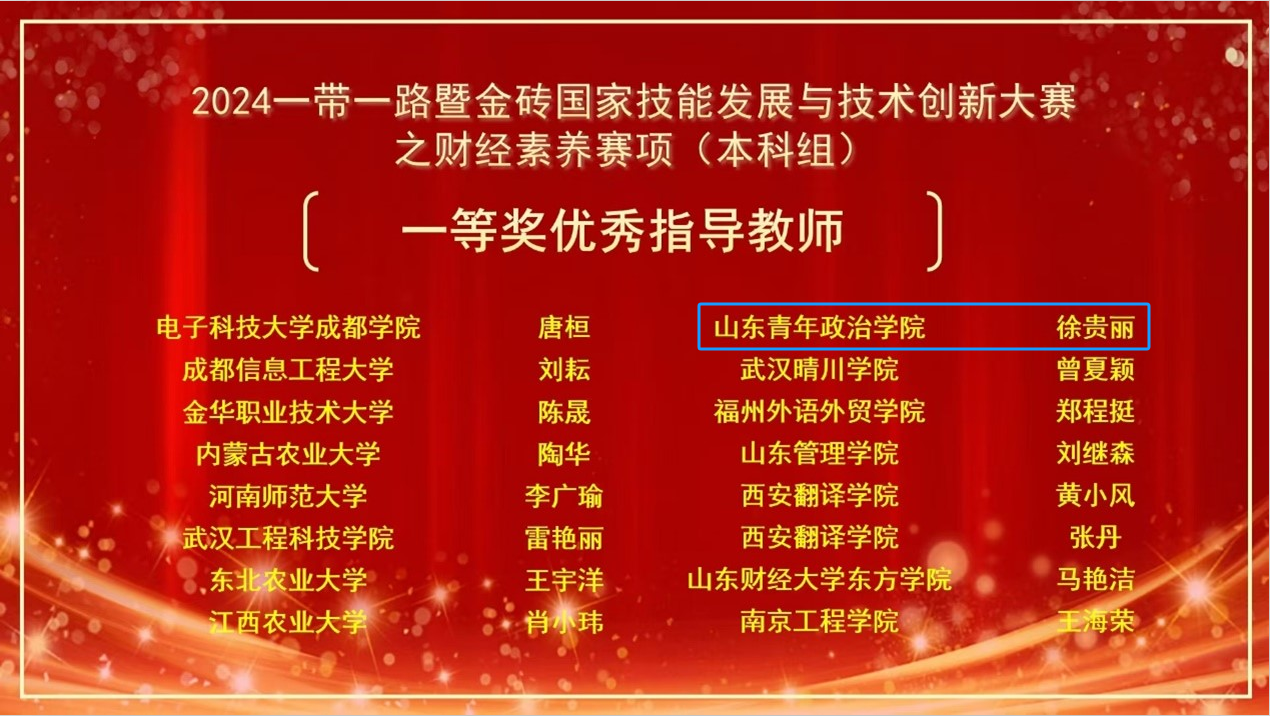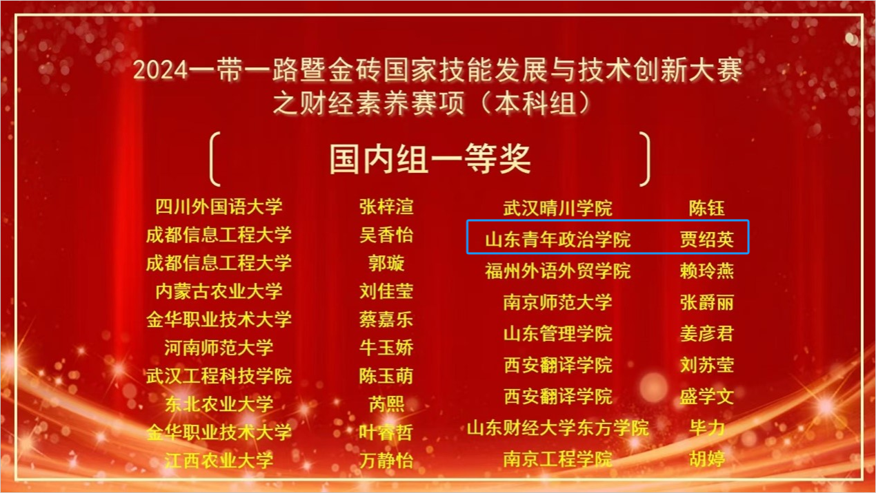 11月24日,2024“一带一路”暨金砖国家技能发展与技术创新大赛(以下简称“金砖大赛”)之财经素养赛项(赛项编号:BRICS2024-ST-142)本科组迎来线上国内赛。经过激烈角逐,我校会计学院2023级审计学专业贾绍英同学荣获国内赛一等奖;指导教师徐贵丽老师荣获优秀指导教师;我校荣获最佳组织奖。