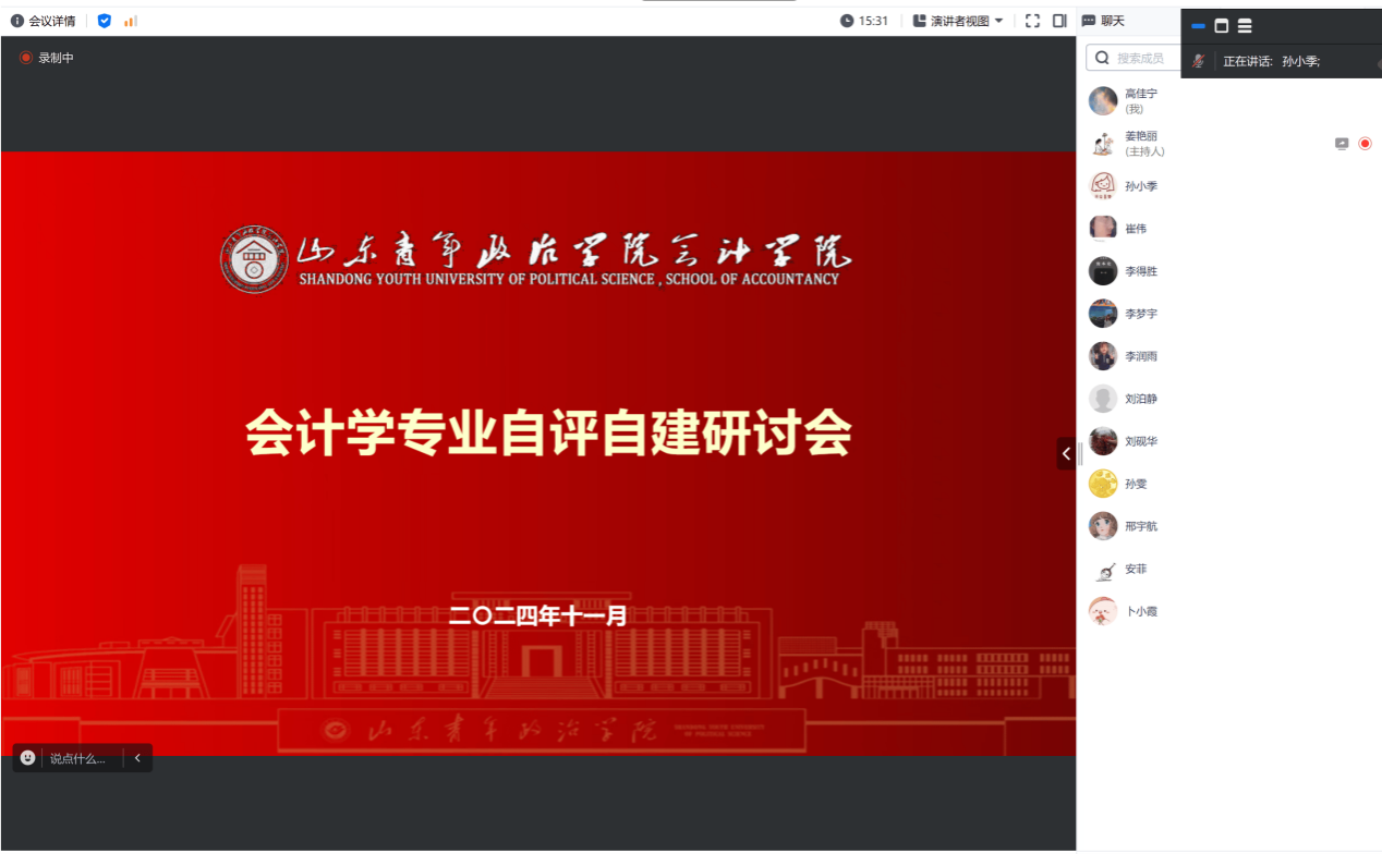 为进一步提升会计学专业人才培养质量和水平,更好迎接本科教育教学审核评估工作,会计学教研室于11月28日线上召开了本科教育教学评估专业自评自建研讨会。本次会议由会计学专业教研室主任姜艳丽主持,教研室全体教师参与。