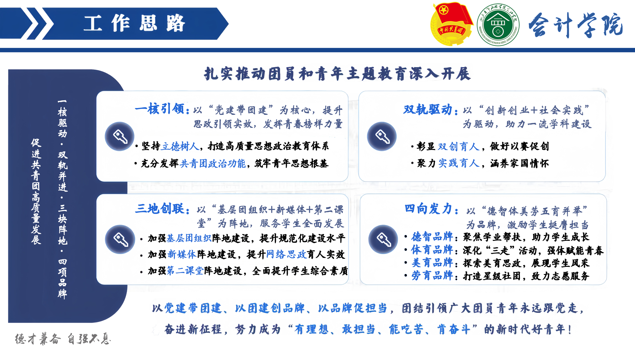 第三次团代会以来,在学校党委的坚强领导和校团委的悉心指导下,会计学院团总支坚持以习近平新时代中国特色社会主义思想为指导,以学习宣传贯彻党的二十大精神为主线,围绕学校学院党政工作要点和校团委工作部署,对照全省高校团建标杆院系培育项目指标,按照“一核引领,双轨驱动,三地创联,四向发力”工作思路,全面深化改革,全面从严治团,着力提升团组织“三力一度”,团结引领广大团员青年永远跟党走、奋进新征程,聚力学院共青团高质量发展,为学院和学校事业的高质量发展贡献青春力量。