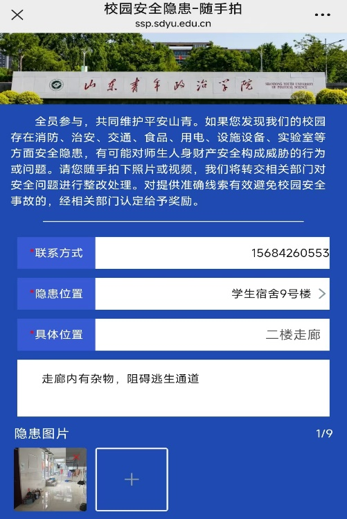 鼓励学生使用“随手拍”小程序,随时随地上报校园内发现的消防、用电、交通等安全隐患;学生会志愿者积极参与宿舍安全隐患排查工作,将发现问题及时告知学生,充分发挥学生主动性,共同维护校园安全秩序。