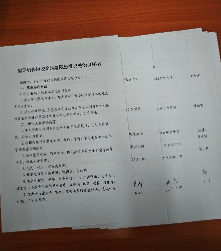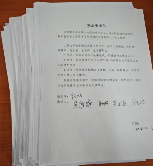 重点针对室内抽烟、违规使用电器、不规范用电及私拉乱接电线等“四类安全隐患”,辅导员老师们开展全面细致的自查,建立宿舍安全隐患工作台账,对于自查中发现的问题,要立行立改;学生签署《安全承诺书》,承诺不违规用电、不存放危险物品,积极参与安全管理;辅导员签订《辅导员校园安全风险隐患排查整治责任书》,明确安全责任。