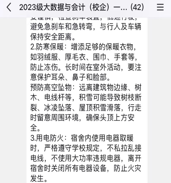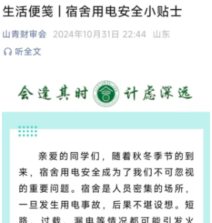 借助学院公众号“山青财审会”、QQ群等网络平台推送安全提示,宣传用电规范和消防知识;组织各班级召开主题班会,强化学生的安全责任意识,普及应急处置能力。