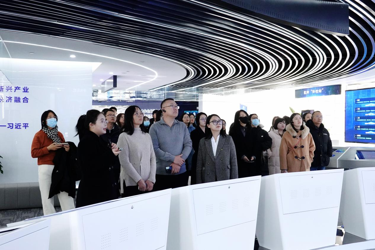 数促中心相关负责人详细介绍了中心发展历程、功能定位、服务体系和运营成效。参观过程中,骨干教师深入体验了数促中心诊断评估、场景体验、套餐推荐、要素保障、人才实训等各个功能分区。数促中心能够通过数字化转型诊断评估,使中小企业精准识别自身痛点与需求,从而为其转型提供定制化方案和针对性指导。通过参观多个行业企业数字化转型成功案例,我校教师系统了解了数促中心推动中小企业数字化转型的前沿技术、创新模式和实践成果。此外,在实训模拟区域,教师通过互动操作,直观感受数字化技术的应用,进一步加深了对中小企业数字化转型的认识。
