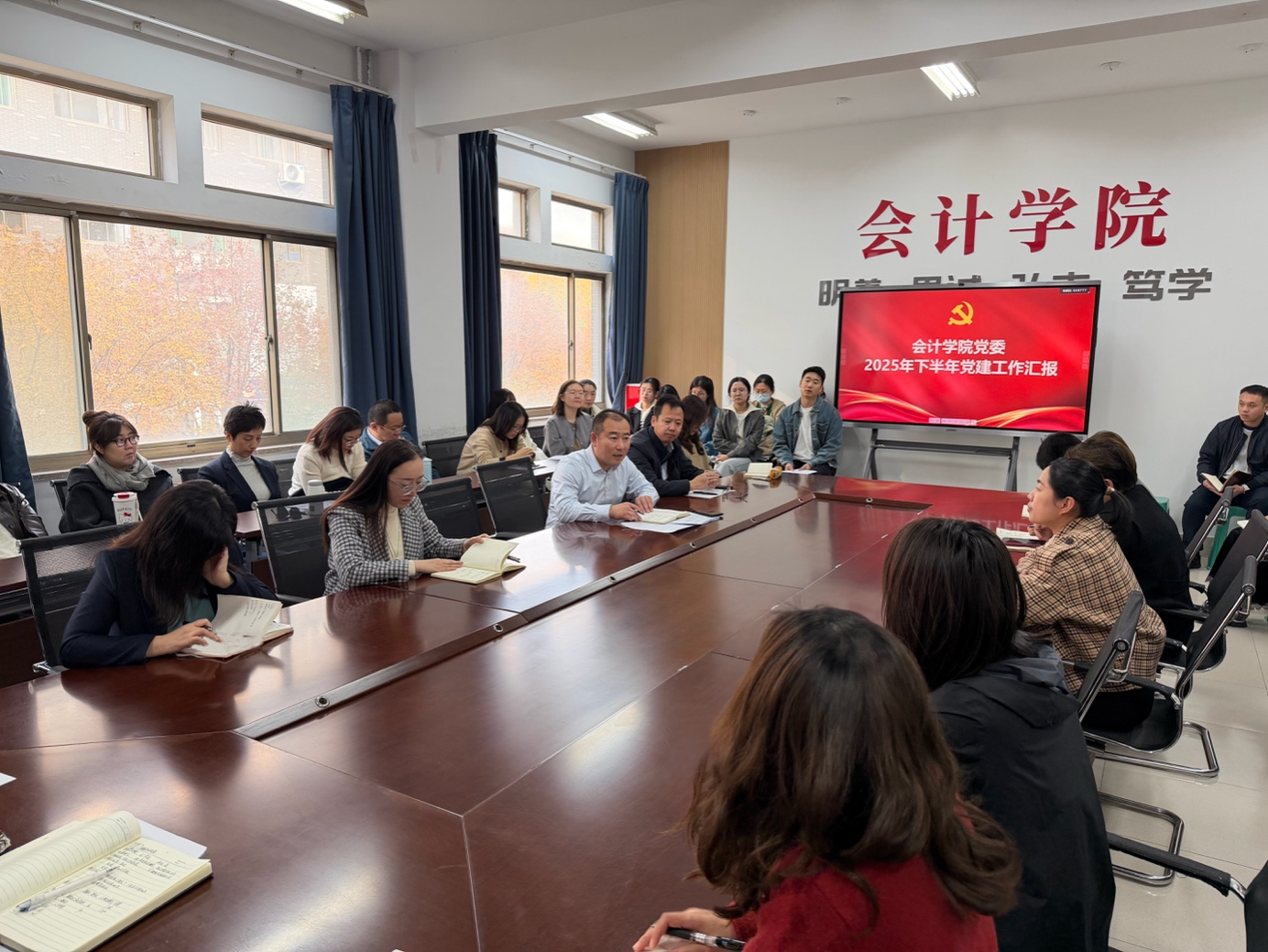 为进一步落实中共山东省委教育工委《山东普通高等学校院(系)级党组织工作指导标准(试行)》的工作要求,11月6日下午,会计学院党委在敏行楼305会议室召开全体党员大会,听取并审议学院党委2025年下半年党建工作报告,并安排部署年底考核等重点工作。