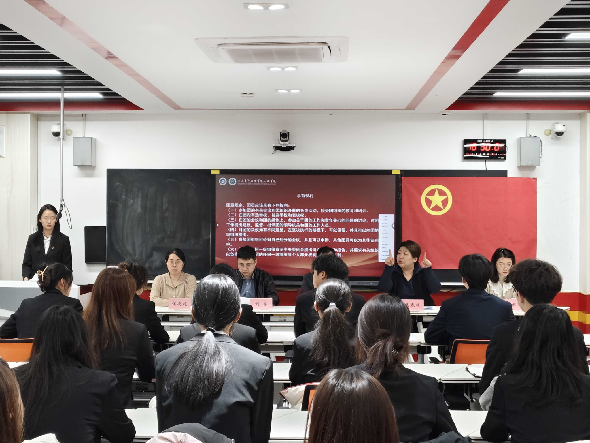 优秀团员代表刘飞翔结合自身学习与成长经历,勉励新团员珍惜团员身份、牢记责任担当,在服务同学、奉献集体中锤炼品格、增长才干。肖姝宇同学带领大家学习《中国共产主义青年团章程》中团员义务与权利相关条例,帮助新团员进一步明确团员标准和行为规范。新团员代表于锦超分享成长感悟,表示将以《团章》为准则,加强理论学习,锤炼过硬本领,在学习实践中争当先进。