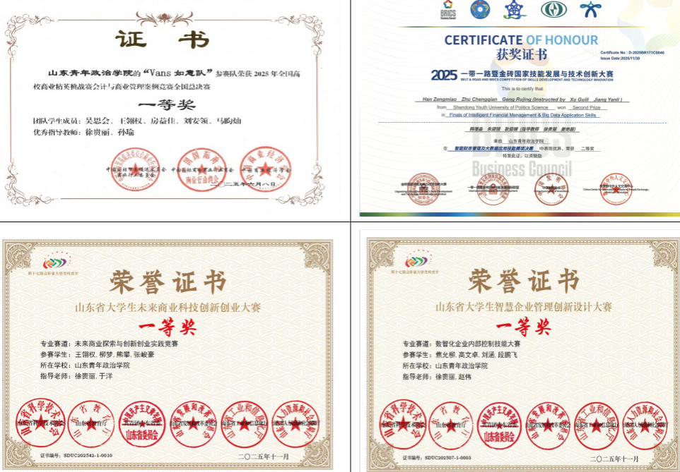 围绕“数智化审计”建设方向,专业在14项B类赛事中收获国家级奖项4项、省级奖项12项。全国大学生智能审计技能竞赛中,审计学2301班于婷婷、李子硕等同学设计的新能源行业舞弊风险研判方案,获国家三等奖,是专业数智化人才培养成效的生动体现。审计精英挑战赛中,傅悦然团队、段鹏飞团队分获国家一等奖和二等奖;网中网财务决策大赛、数智化业财税融合大赛中,学生运用RPA财务机器人、Python数据分析等工具,分获国家二等奖和国家三等奖各1项;山东省大学生科技节系列赛事中,审计数字化转型、内部控制案例分析等获省级一等奖2项,形成“以赛促学、以赛强技”的数智化能力的培养路径。