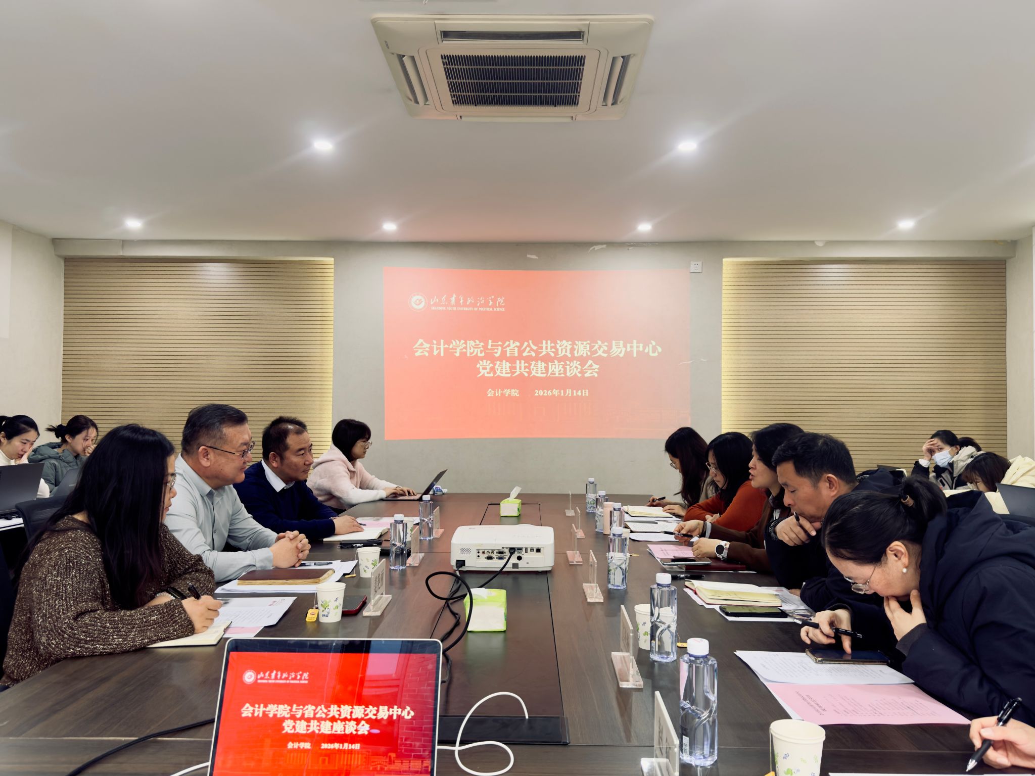 1月14日上午,会计学院与山东省公共资源交易中心举行党建共建座谈会。山东省公共资源交易中心财务部党支部书记徐波、副部长罗文,山东青年政治学院会计学院党委书记姜宏宝,党委副书记、院长王智勇出席活动。双方围绕“党建引领、共建共享”主题进行深入交流,共同擘画以党建为纽带推动合作共赢的发展蓝图。