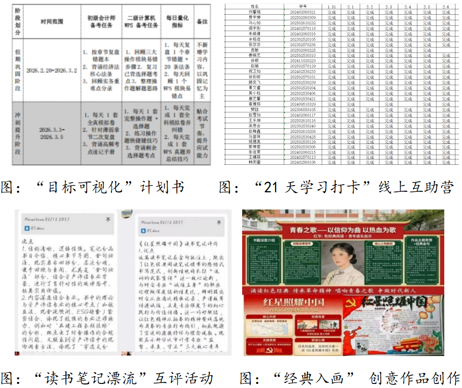 以学铸魂,在深学细悟中明德启智。组织开展“学业启航 规划赋能”主题活动,通过“目标可视化”计划书设计大赛引导学生科学分解学期目标,并借助“21天学习打卡”线上互助营营造积极向上的学习氛围,有效提升了学生的自主规划与管理能力。同时,深入推进“品经典·润初心”读书活动,通过组织“深读一本书”读书笔记征集、“经典入画”创意作品创作及“读书笔记漂流”互评等,引导学生在深读经典中启迪智慧、陶冶情操,厚植家国情怀,实现专业技能与思想境界的同步提升。