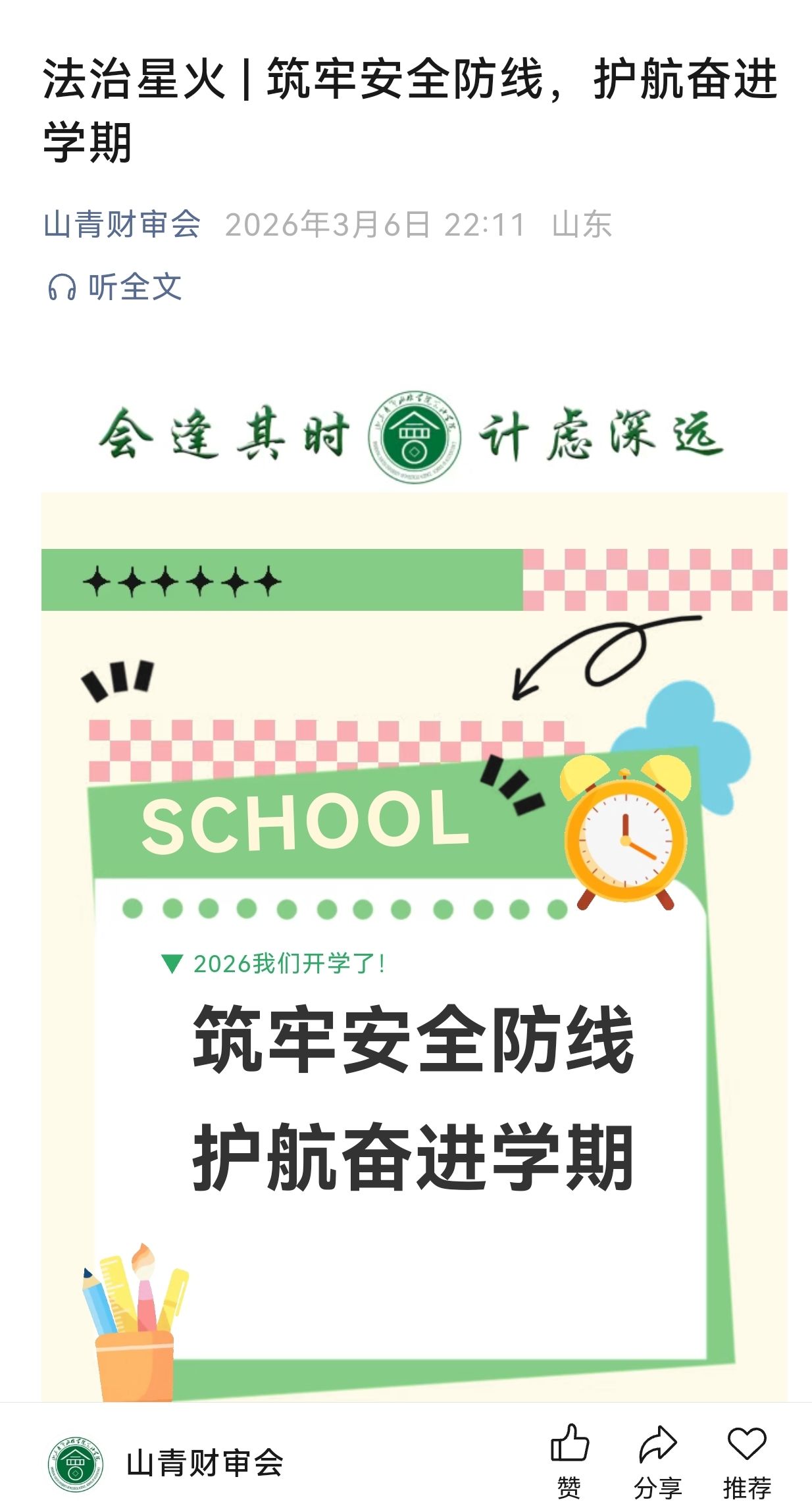 为深入贯彻落实上级教育主管部门关于安全生产工作的决策部署,根据《山东省教育厅关于扎实开展安全开学“第一课”活动加强校园安全防范工作的通知》及学校相关文件要求,切实保障新学期教育教学秩序平稳有序与师生生命财产安全,会计学院将“安全开学第一课”作为新学期的政策形势课、思想动员课、警示教育课和安全部署课,精心组织、迅速行动,于开学前后系统性地开展了一系列安全教育与安全检查工作,全力为新学期开好局、起好步奠定坚实安全基础。